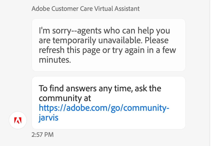 On https://creativecloud.adobe.com/ there was a virtual assistant "chat" box in the bottom right which can sometimes get you to a real agent. This time I got the following.