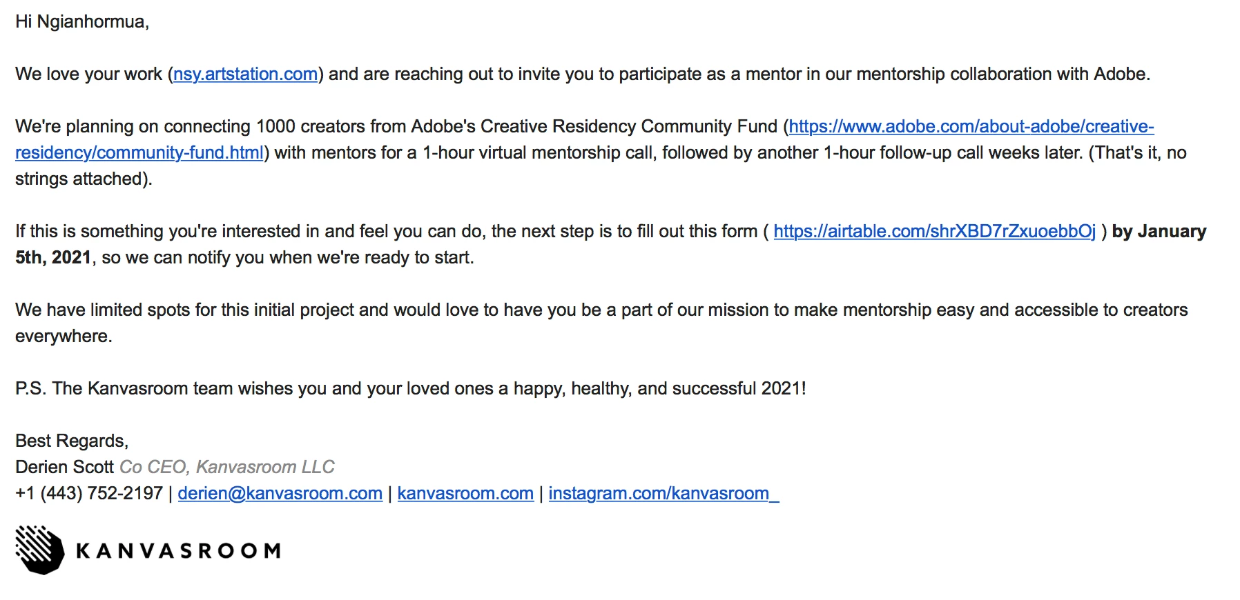 I received an email from someone named Aaron Pludwinski with "Kanvasroom." They claim they are working with Adobe on the Adobe Community Awards and are looking for mentors in a mentorship program. The reward for helping a 1 year t