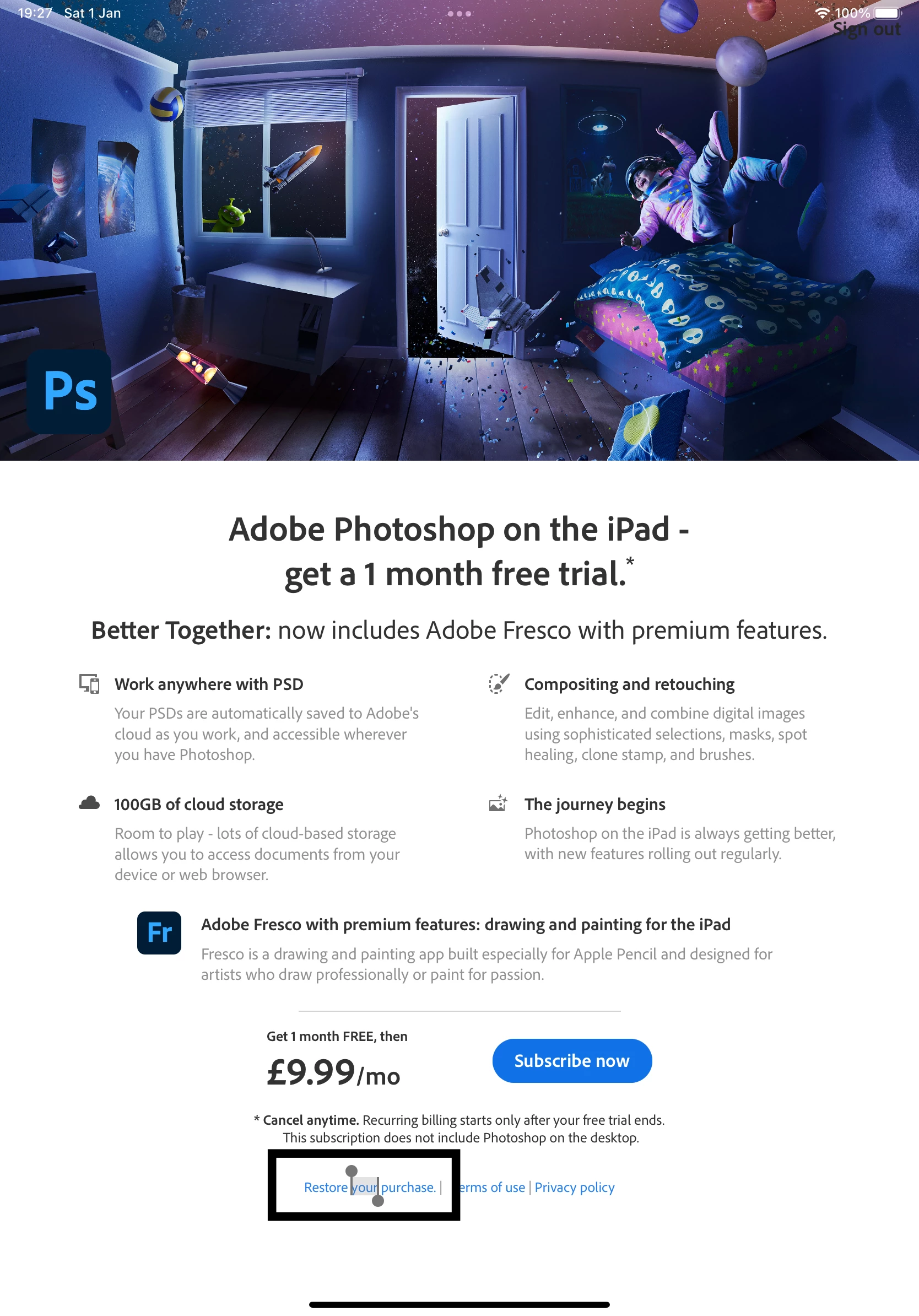 Hi, I've been working on photoshop on my iPad for a couple of days. Today it has kicked me out...I have tried to sign back in but it keeps telling me to restore my purchase...the issue is that the button on the app does not seem to work.
