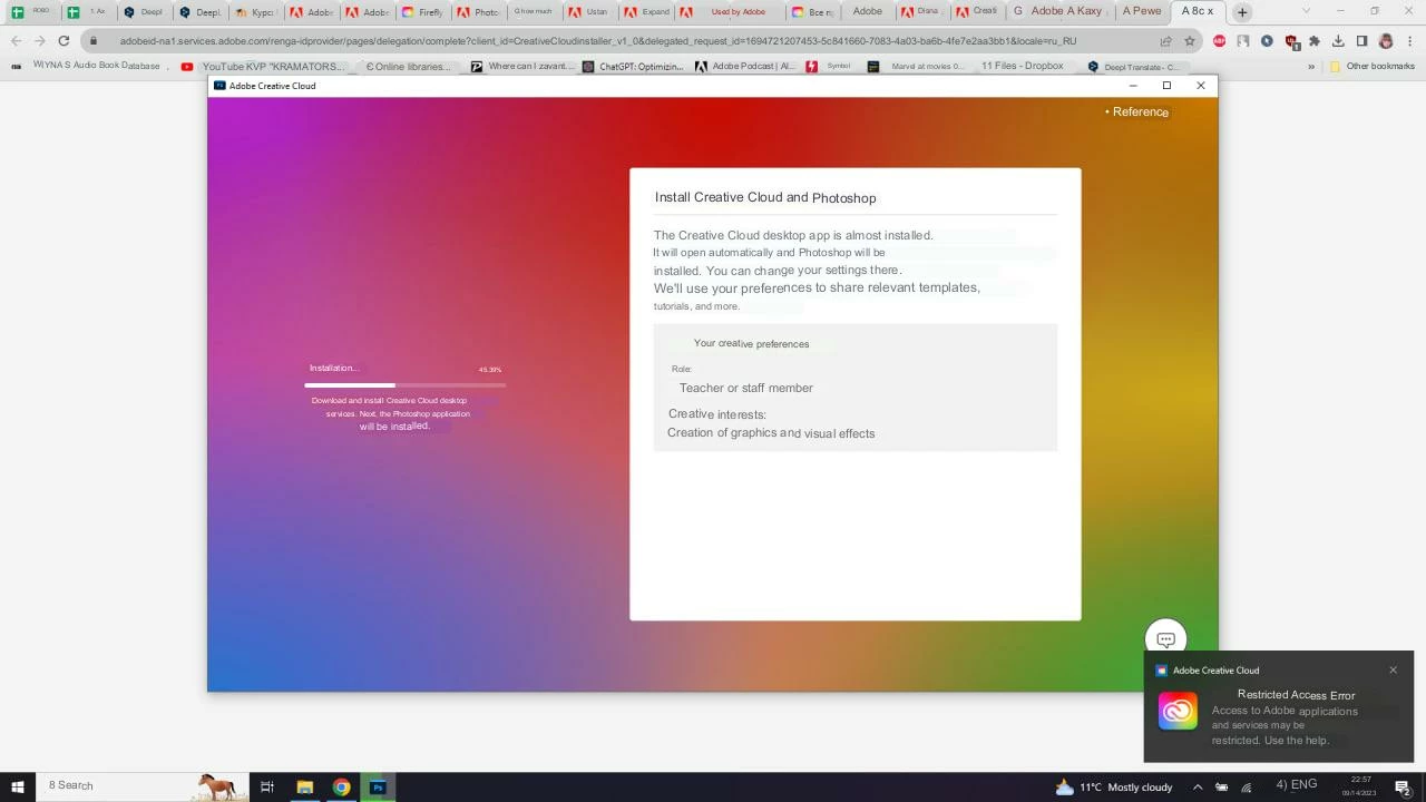 Здравствуйте, подписался на Creative Cloud, начал загружать приложения, но Creativecloud не устанавливается. Пишет: «Ошибка ограниченного доступа. Доступ к приложениям и службам Adobe может быть ограничен». До этого был пакет программ в 19, потом я ими не пользовался и как оказалось на компе еще что-то осталось. Скачал утилиты для полного удаления, удалил но проблема не решилась от слова полностью, буду благодарен за подсказку что делать