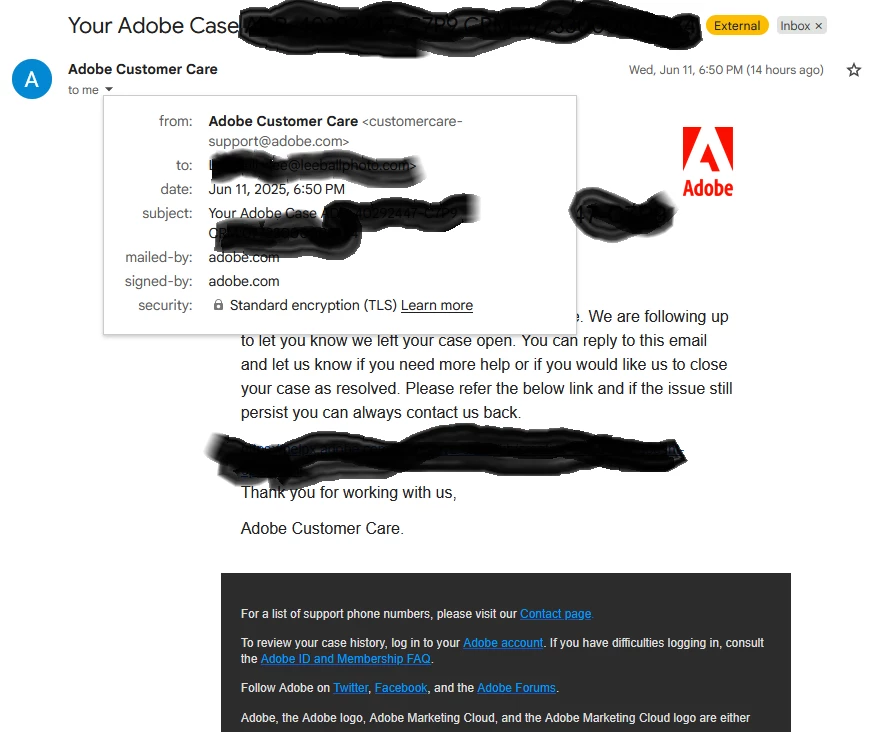 I received an email from adobe about a case number. Not a community support conversation but a case number with adobe. Adobe employee at chat confirmed the email is from adobe. That chat took over 30 minutes. The email states “To review your case history, log-in to your adobe account. I cannot find any case anywhere on my adobe account. So, I contact chat again. Another 30 minutes and the chat agent finally agrees to provide what I am hoping to be a step-by-step instruction on how to find my adobe account case history. It was like pulling teeth to get this out the adobe chat person employee.