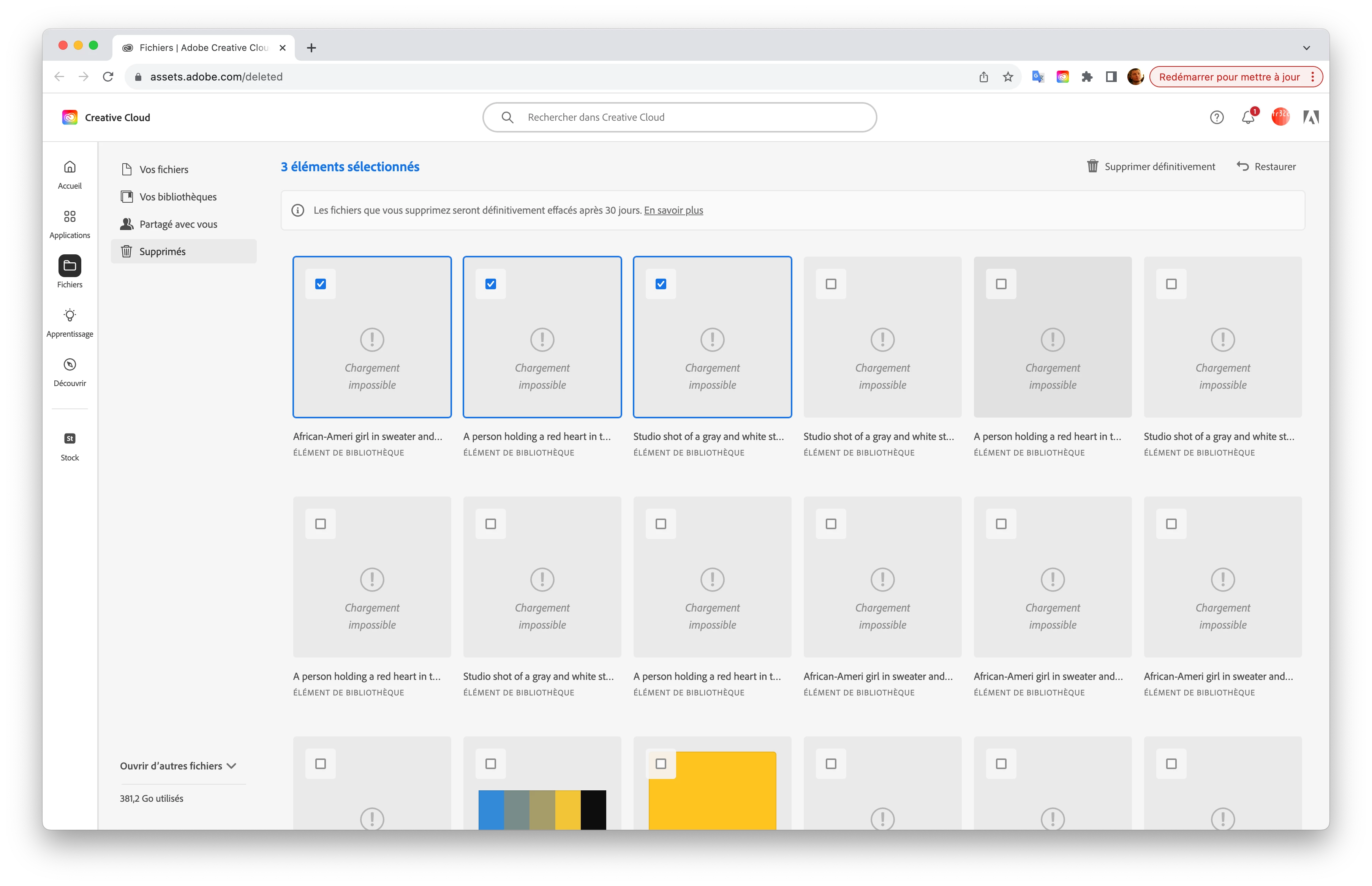 And it is complicate for me, as a freelancer, to replicate this situation out of the training sessions. Once done, I still can delete the incriminated images, although, different issue, they don't dsplay any thumbnail in the "recently deleted" part of CC assets.