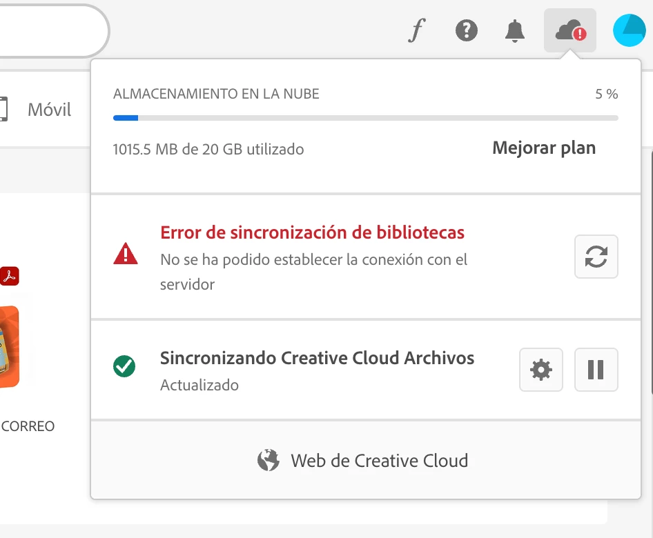 Creative Cloud shows an error on the "Synch" menu (Cloud Activity) that states "Error in Library synching. Cannot connect to the server". All other function work well, and connectivity is fine. Any ideas what´s going wrong?