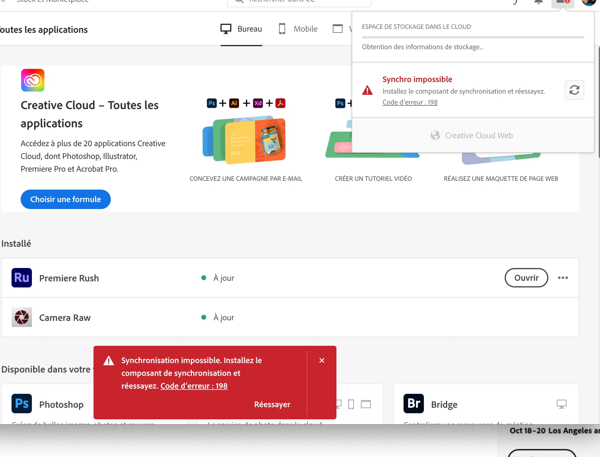 Hello, I'm on MacOs, and since I wanted to reinstall the Adobe Cloud Suite, even if I can install for example Rush, it is impossible to synchronize.