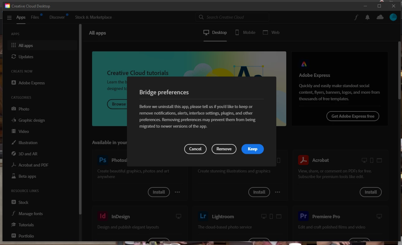 I uninstalled all of them but Bridge is refusing to go away. Every 15-30 minutes, Creative Cloud appears with pop-up saying "before we uninstall this app, please tell us if you'd like to keep or remove notifications, alerts, interface settings...." With the options "Cancel" "Remove" and "Keep."