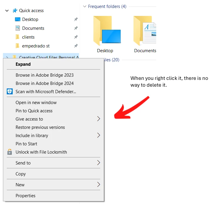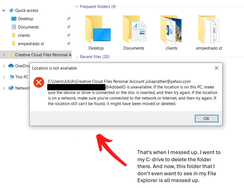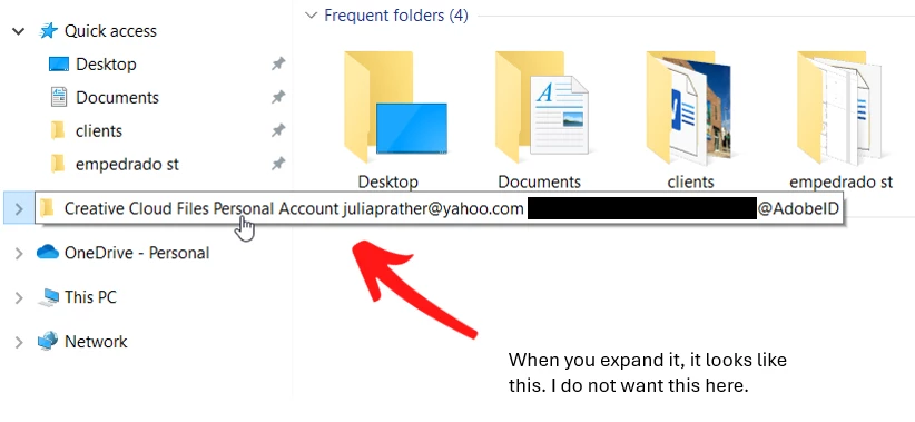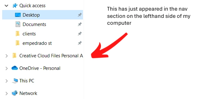 This Creative Cloud thing just appeared and I wanted to remove it, but all I ended up doing was breaking stuff. My first choice would be to be able to remove this Creative Cloud folder from my nav section altogether. My second choice would be to leave it there but unbreak it. Do I need to remove and reinstall? Thank you, Adobe Forum!