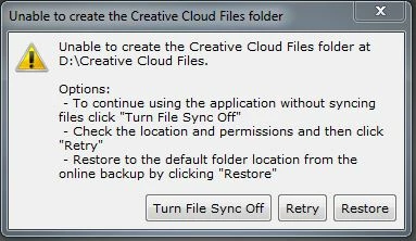 I keep getting an Alert, Unable to Create Creative Cloud File Folder. I get the options to Turn file Sync off, Retry, Restore.