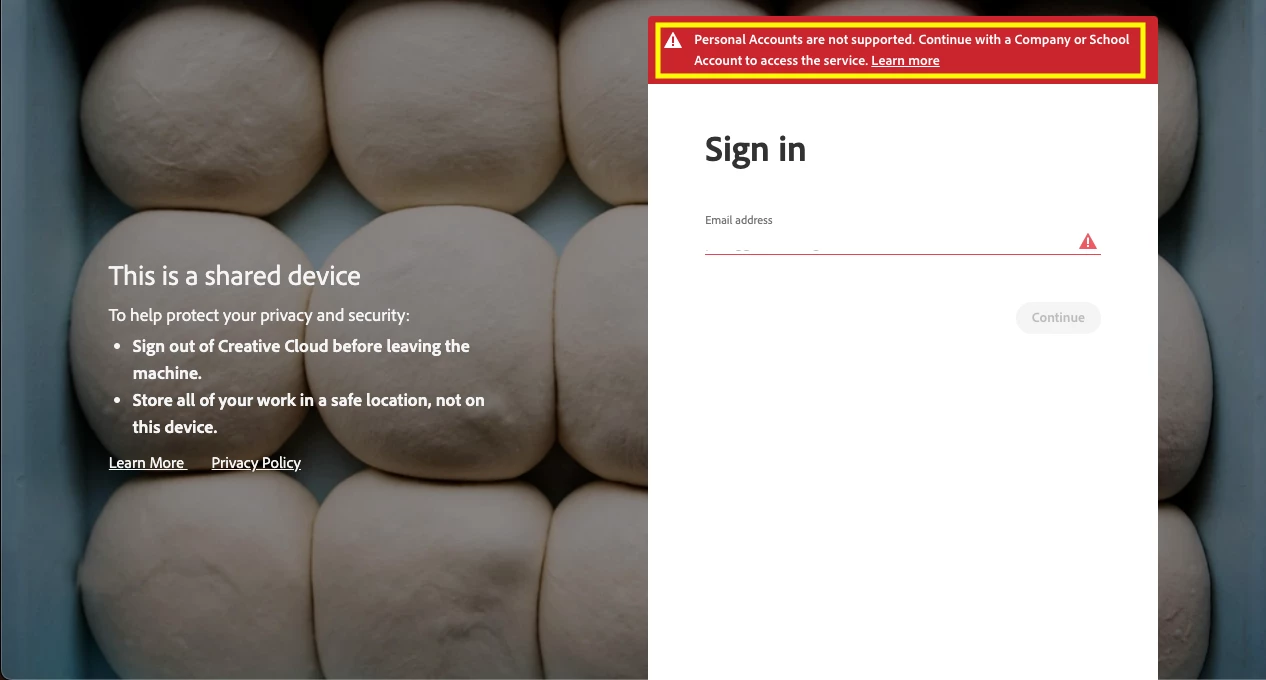 "Personal Accounts are not supported. Continue with a Company or School Account to access the service."