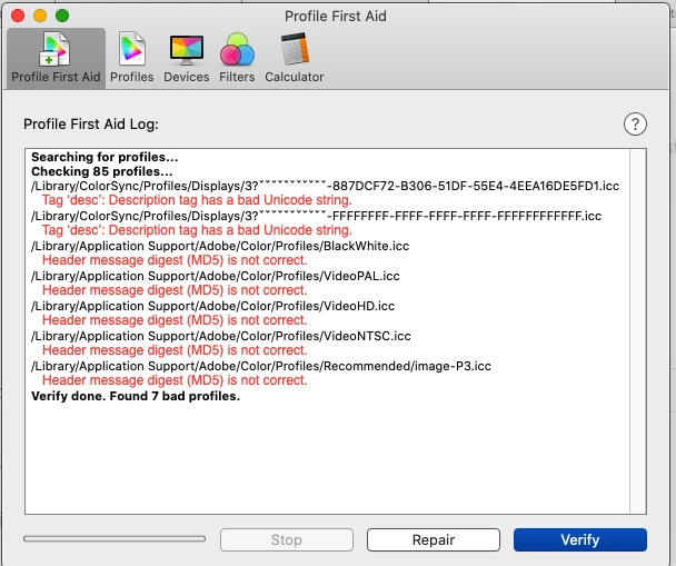 unable to repair ColoProfiles in MacOs Cataline ColorSync Utility