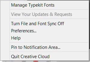 The context menu looks different from my laptop, which has the working Creative Cloud; it does not have the stats on my Creative Cloud storage. Turn File and Font Sync Off does not change if I click it. All the other selections seem to work properly.