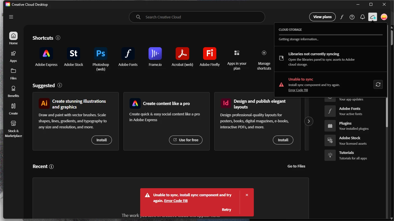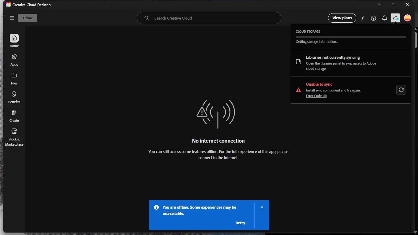 Hi, I've been having issues with my Creative Cloud as it can't sync the library and get an error code 118. It also said that my PC appeared offline but my wifi connection is stable, tried using other connection too but still doesn't work. I tried uninstall and reinstalling it but the issue persists. Also tried to do something with the firewall and stuffs, but still doesn't work. Is there any other methods I can try to fix it? Thank you.
