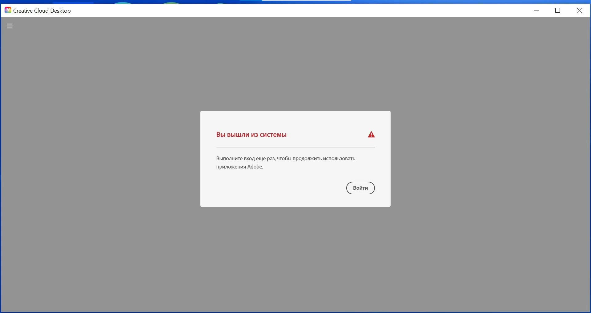 The writing in Russian says: "You've been singed out. Please, sign in again to continue using Adobe apps." button: "sign in"