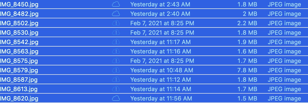 I moved photos from photoshop. Simple RGB 8 to a folder. from there I am attempting to upload to a publisher. But only some of the photos went so I went back through every image to make sure they were OK. They are only 9mb and 8 bits in RGB. However in the folder on my Mac desktop next to some are faded exclamation marks and some have clouds.