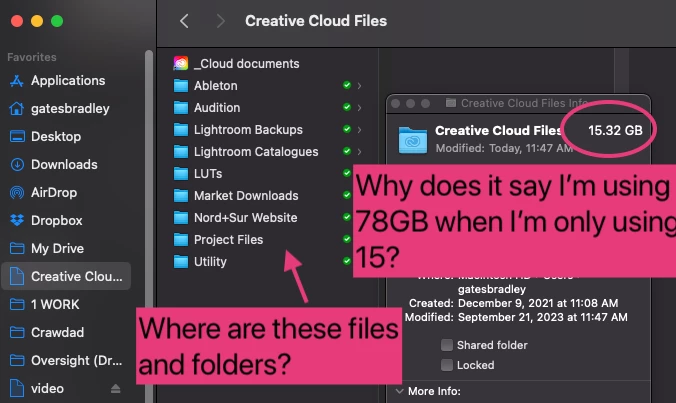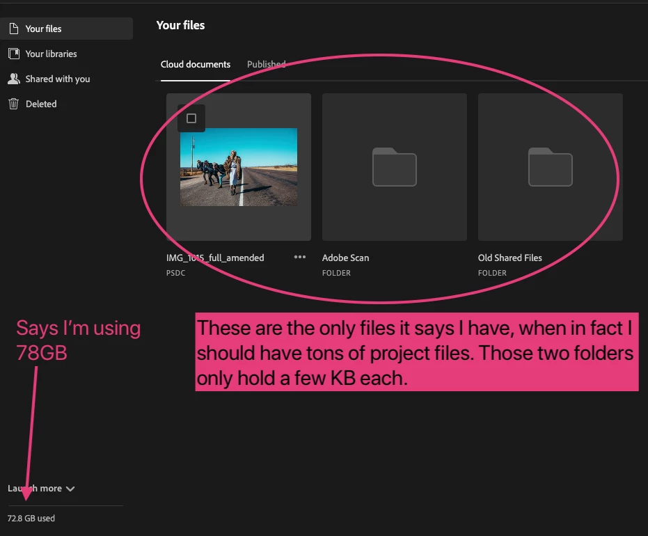 Adobe says I am using 78.3GB of my 100GB of cloud storage. However, on my local machine (Macbook Pro M1 Max, macOS Ventura) the Creative Cloud folder is only using 15GB. What's more, when I log in to assets.adobe.com it says I only have 4 files, worth a few megabytes. There is nothing in the deleted files folder. What's going on?