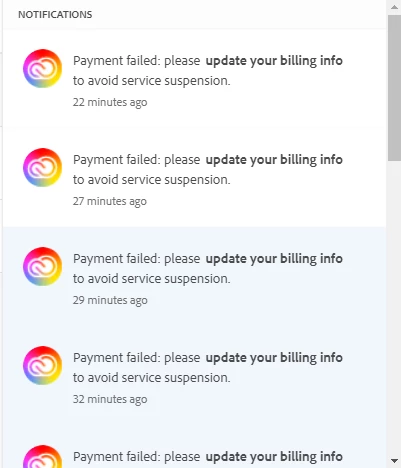 I've received 15 of these notifications since last night when I updated my payment information, and Adobe actually took my money. Am I now paying them to harass me?
