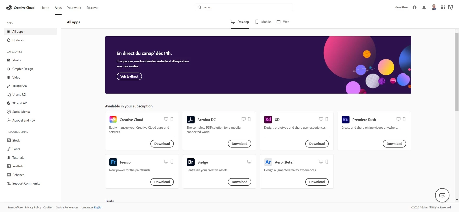 Creative Cloud Desktop and the Creative Cloud web page is showing banners at the top in French with links to the French website for Adobe.