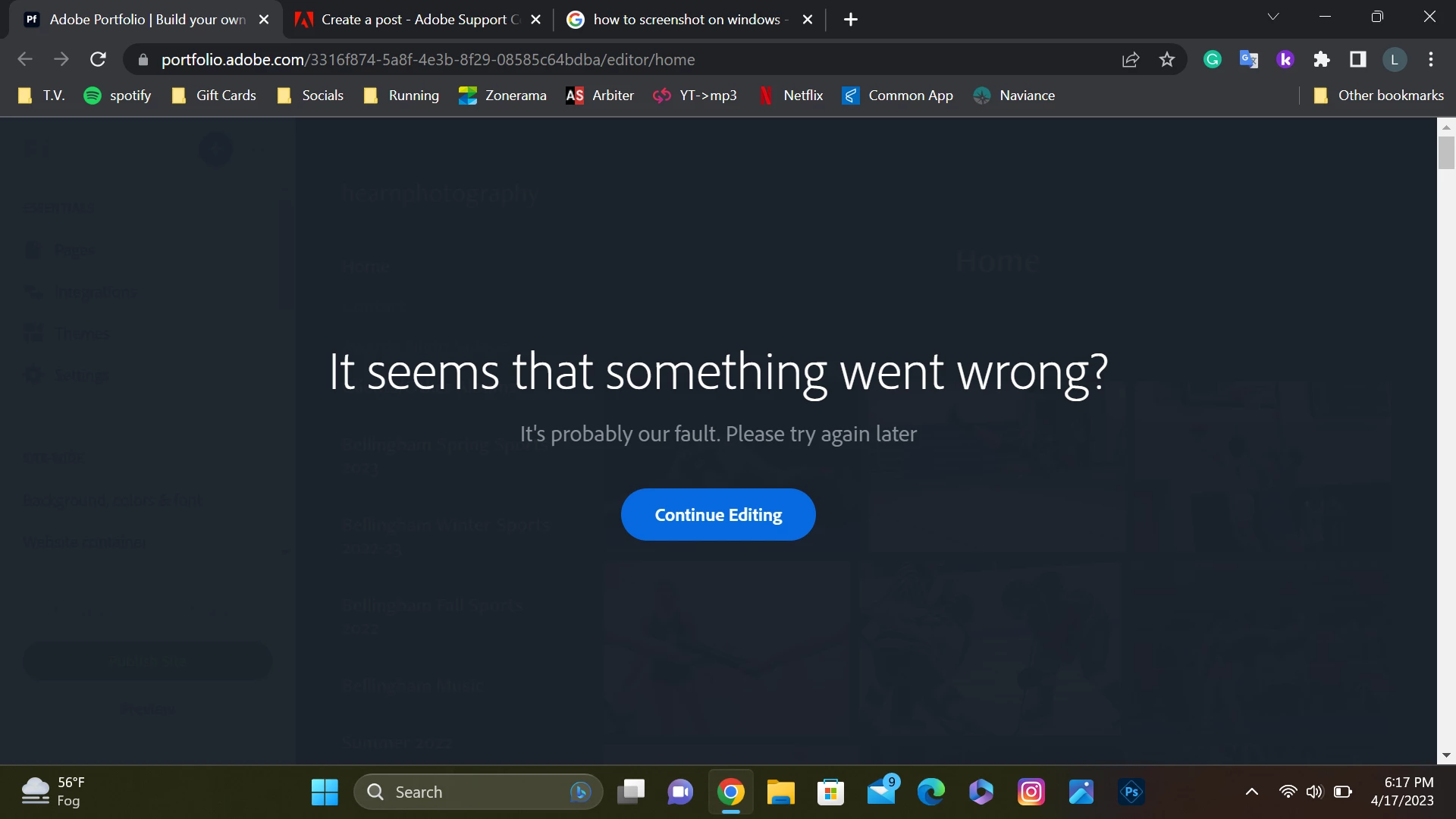 I'm a photographer and connect my Lightroom albums right to my portfolio, it works really well for me but recently I have been getting an error message saying that something went wrong and it was probably their fault so try again in a little bit. I tried restarting and updating my laptop and web browser, but neither worked. I also tried publishing and republishing the site but now it won't republish, it's like it's almost fully loaded but can't fully get there.