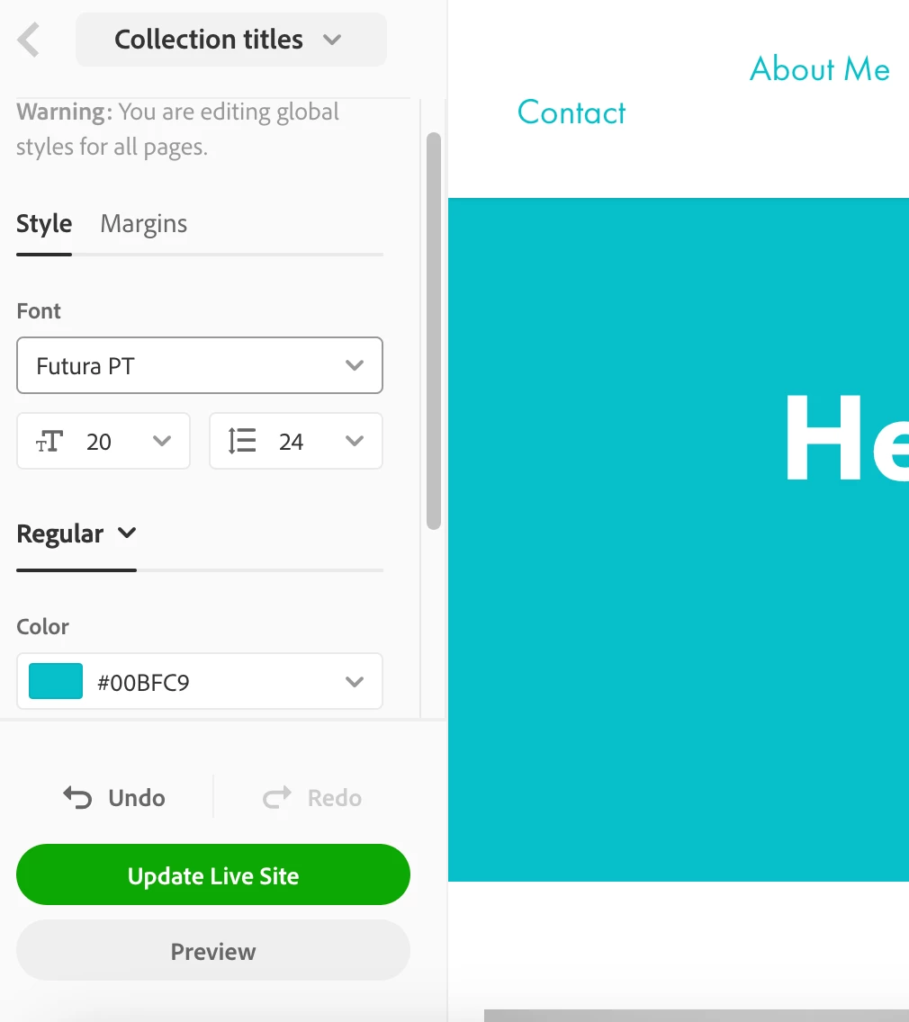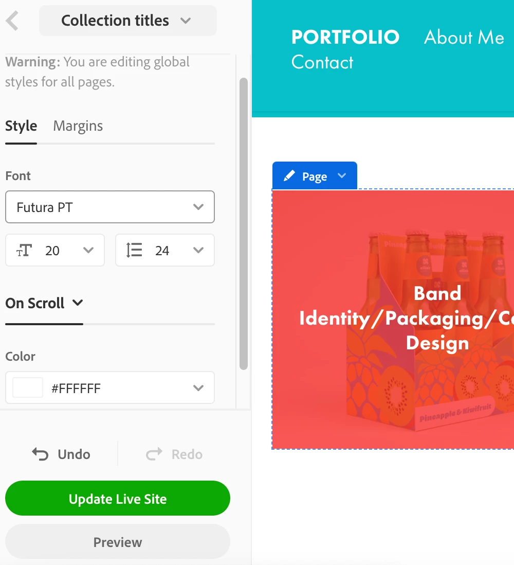 I'm having some sort of issue on adobe portfolio where I have changed the text colour and it won't change, its still white and I have it selected as this aqua colour on the regular display, then it works on the scroll display as it is white as you can see in the images below. The blank space in the left corner is supposed to have the word 'portfolio', but its just not showing as the aqua colour!!
