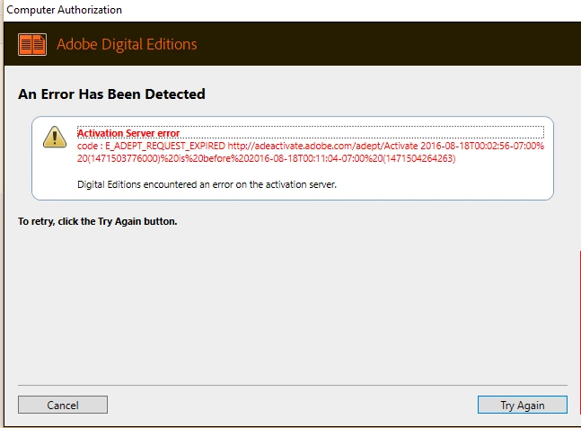 I've purchased an ebook through www.bol.com and trying to open .ascm file on my laptop at home (Fes, Morocco)  through your product but I receive the E ADEPT REQUEST EXPIRED error. A search reveals that this might have something to do with the time zone. Please help? I have already lost quite some time through this. Thank you!