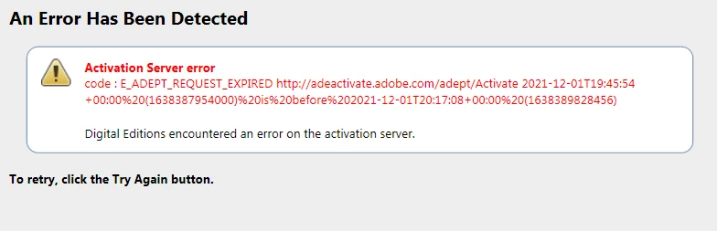 I'm trying to authorize my computer (not an ebook or epub or whatever). But each time, I receive the Activation server error : E_ADEPT_REQUEST_EXPIRED... I have tried all the tricks : unauthorize the computer (it did not work unless I went in Run, regedit, etc. to delete the Adept keys), install the 3.0 version, unistall everything. I am at the end of options. Anything else I could try? My goal is to read the books I borrow from the library on my Kobo. I'm a little desperate at this point, and no support from Adobe. I have also tried the time thing, but everything is ok for the date, the time, etc. on my computer. Help anyone?