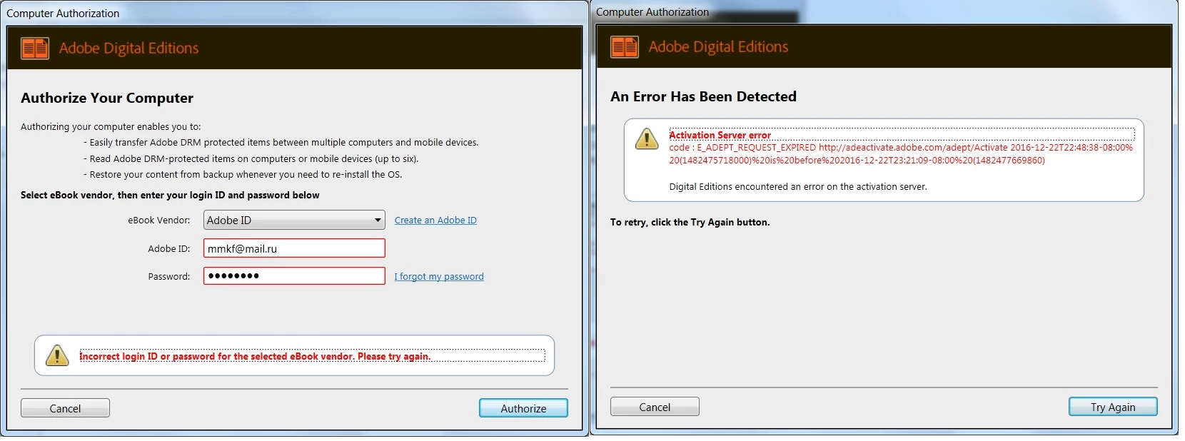 Problem with Adobe Digital Editions and Adobe ID authorization.