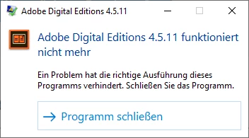 ich benutze Adobe Digital Editions schon ein paar Jahre und hatte nie Probleme. Seit ein paar Tagen habe ich aber schon 2 Mal das Problem gehabt, das das Programm nicht mehr gestartet werden konnte.