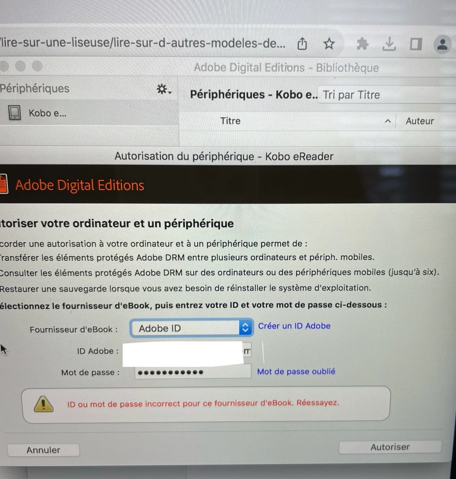 Adobe ID mot de passe ou ID incorrect