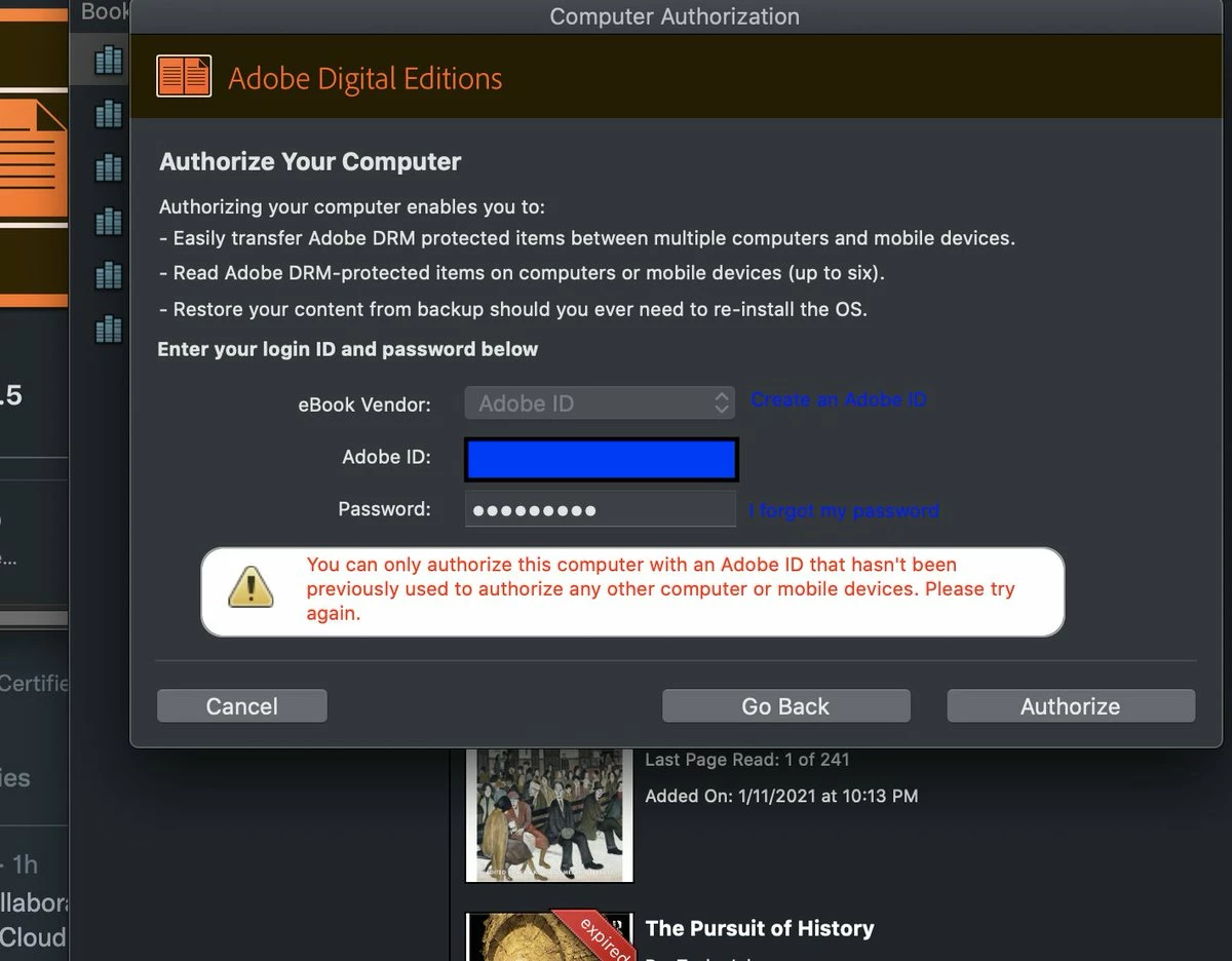 How can I authorise my account on two devices? When I try I get this message (attached). Why does it say I can read on up to six devices but also not let me authorise more than device? So confused - and rapidly losing time I need to write an assignment,