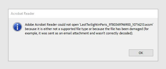 I expected my books to simply appear. A few posts on here have indicated this only works from Android->Desktop, and not the other way around, so I copied the acsm files and tried to open them. However, I get an error: