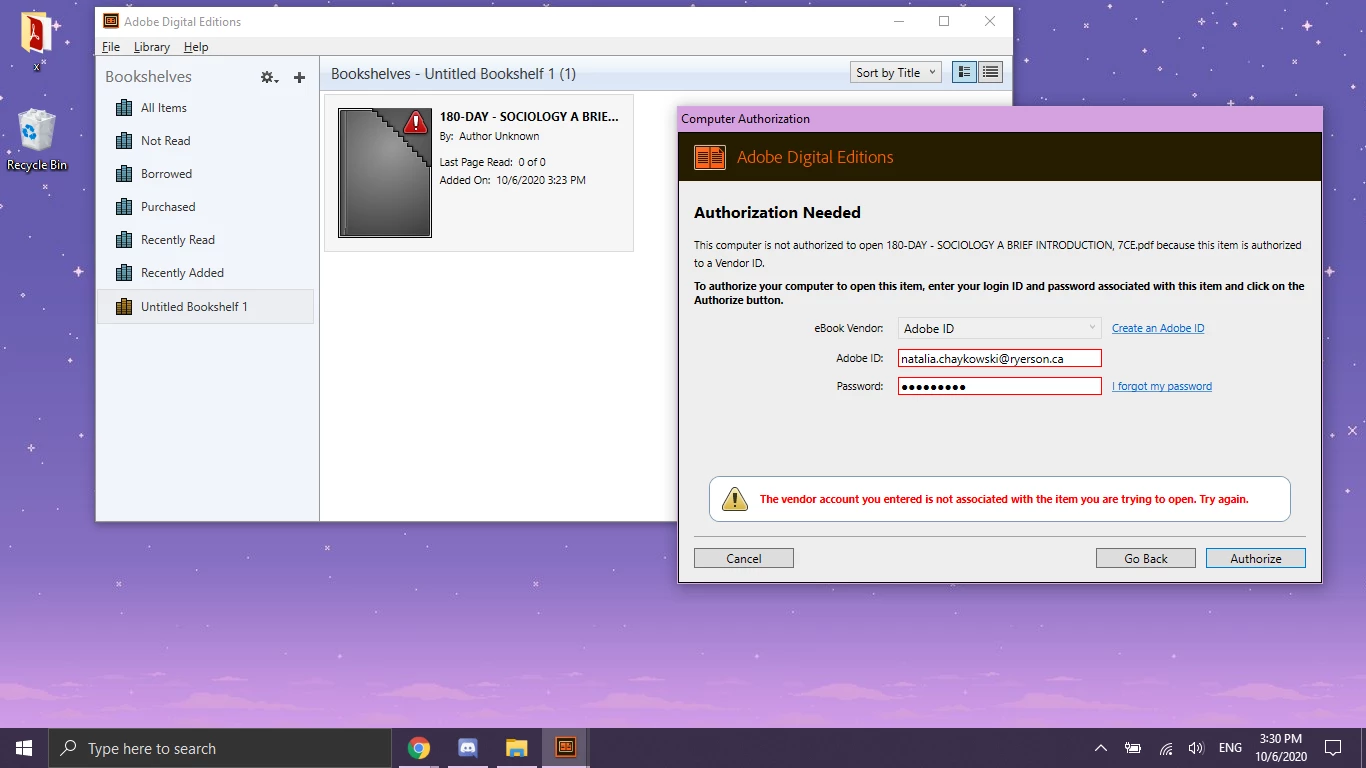 I recently had to reset my computer. I redownloaded ADE today and tried to reopen my textbook. It will not open for me. It asks for authorization, but does not give me the option of changing the Vendor ID. The drop-down menu is grayed out and unclickable. I have input my adobe ID, but I don't think it will work without changing the Vendor ID because I bought this textbook through my campus store. Help?? I have a quiz to complete TODAY!