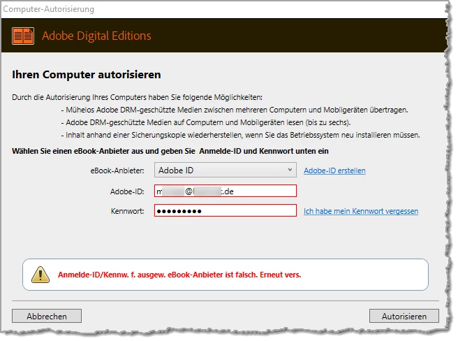 Anmelde-ID/Kennw. f. ausgew. eBook-Anbieter ist falsch. Erneut vers.