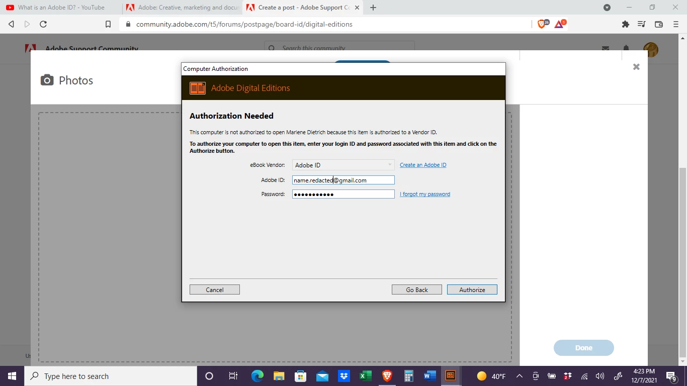 Reinstalled and now must authorize. I'm trying to read a library book and authorization is needed. I can't erase the authorization because there is none. I keep getting the error message: