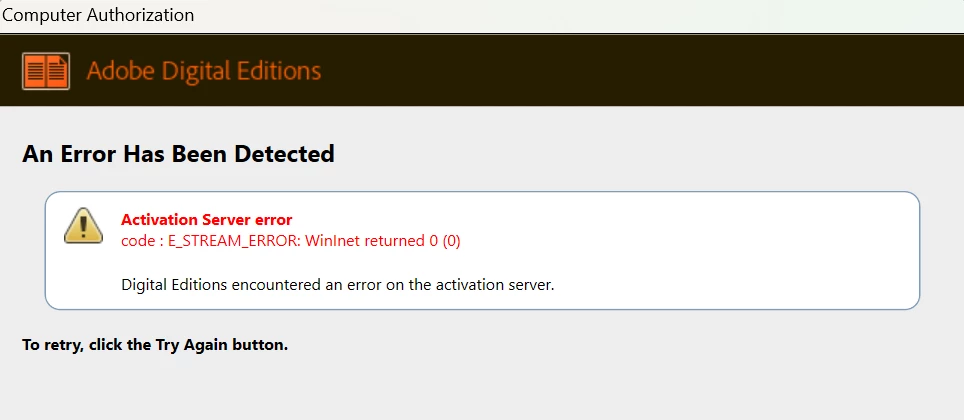 I simply can't authorize my computer with Digital Editions. Every time I try, I get an E_STREAM_ERROR. I really need to get this working - can anybody help?