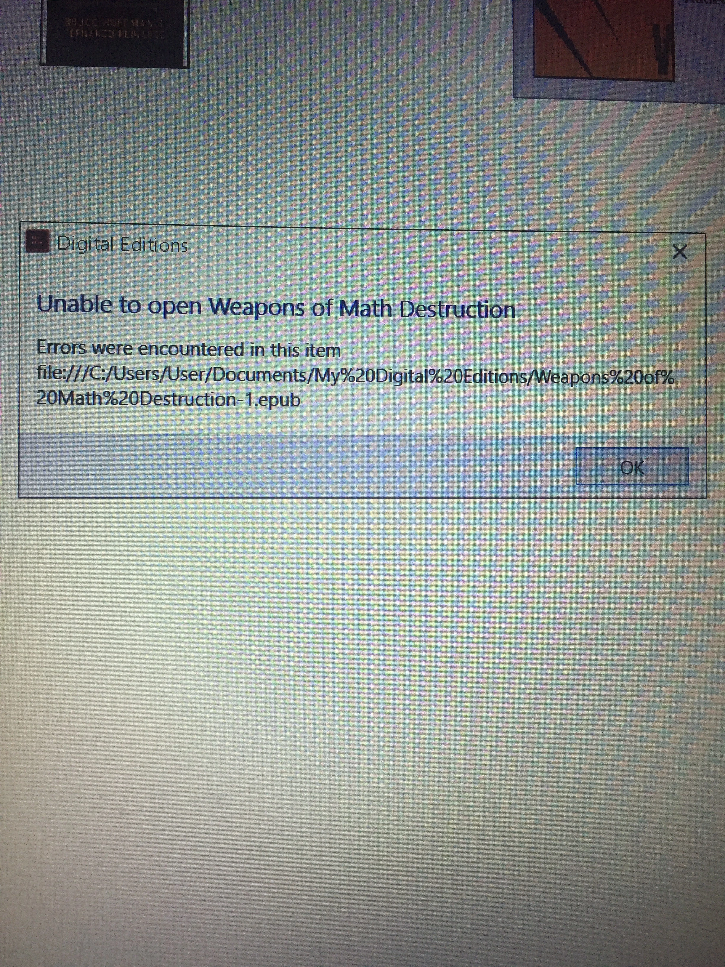 I can’t open this item to read it and my computer is authorised. What do I do? This is the error message it gives. The item/ebook I want to open is in ePub format not pdf.