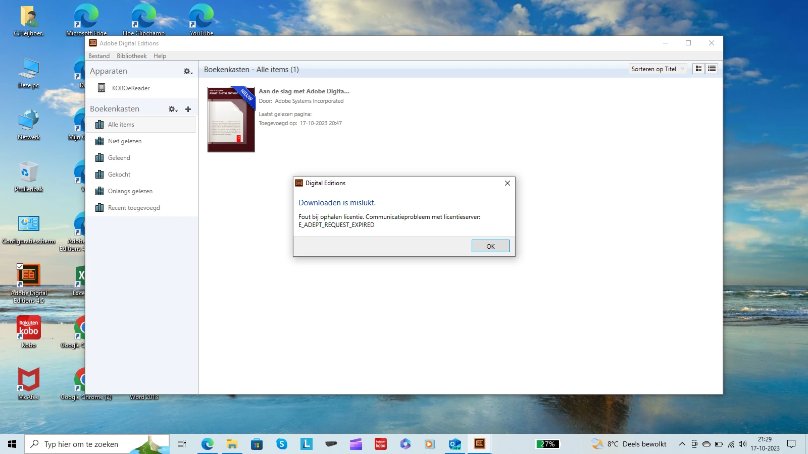Om een boek op mijn ereader te kunnen zetten is het nodig dat ik deze open in adobe digital editions. Dit ging altijd prima, echter nu ineens niet meer. Ik krijg de volgende foutcode: Downloaden is mislukt. Fout bij ophalen licentie. Communicatieprobleem met licentieserver E_ADEPT_DATABASE