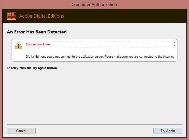 Recently I just download Adobe Digital Edition 4.5.4 on my Windows 8 laptop. But when I try to authorise it, it will not let me do so and keep showing connection error. It shows the same error when I choose not to authorise it. I have tried the 'registry' step found on forum but the problem still exist. Any solution?