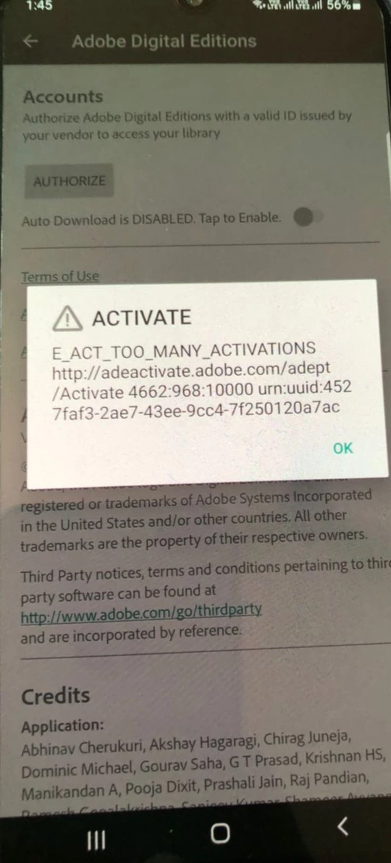 E_act too many activations error when trying to authorize an Digital Edition