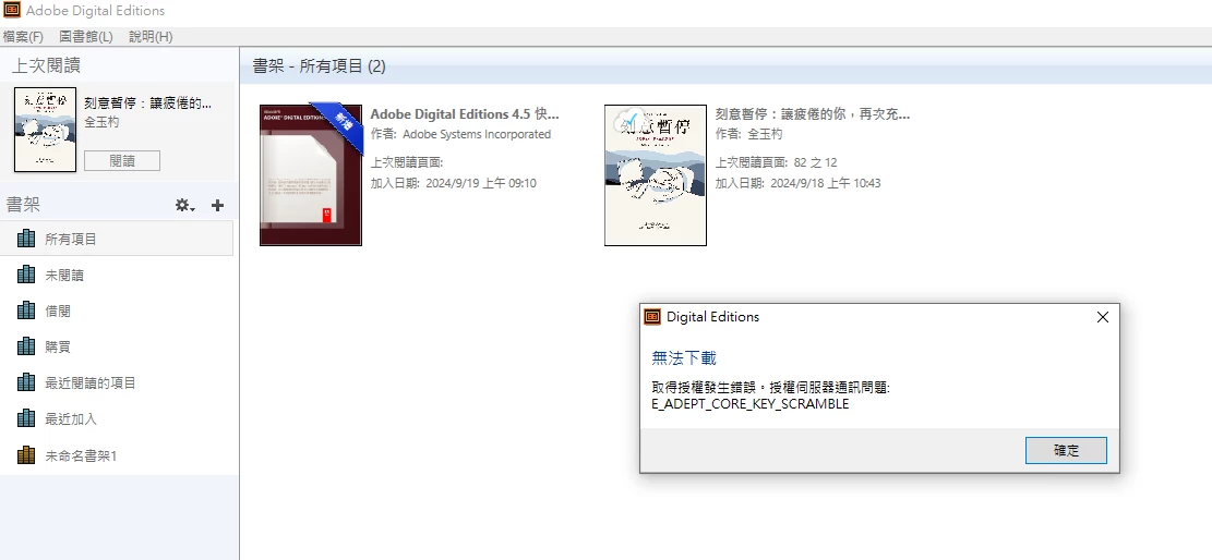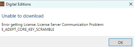 This just happened to me buying an ebook on Google Books (Sep 18) and I found this page with the identical error message so I tried borrowing a library ebook as an epub and it downloaded without any problems. In the past when there were problems getting epubs in Adobe Digital Editions it affected both bought and borrowed/library ebooks. I used to have to unlicense my device and relicense it to fix the problem. I'm thinking of contacting Google Play about this but if others bought their ebooks from a different ebook seller than Google that wouldn't make sense.