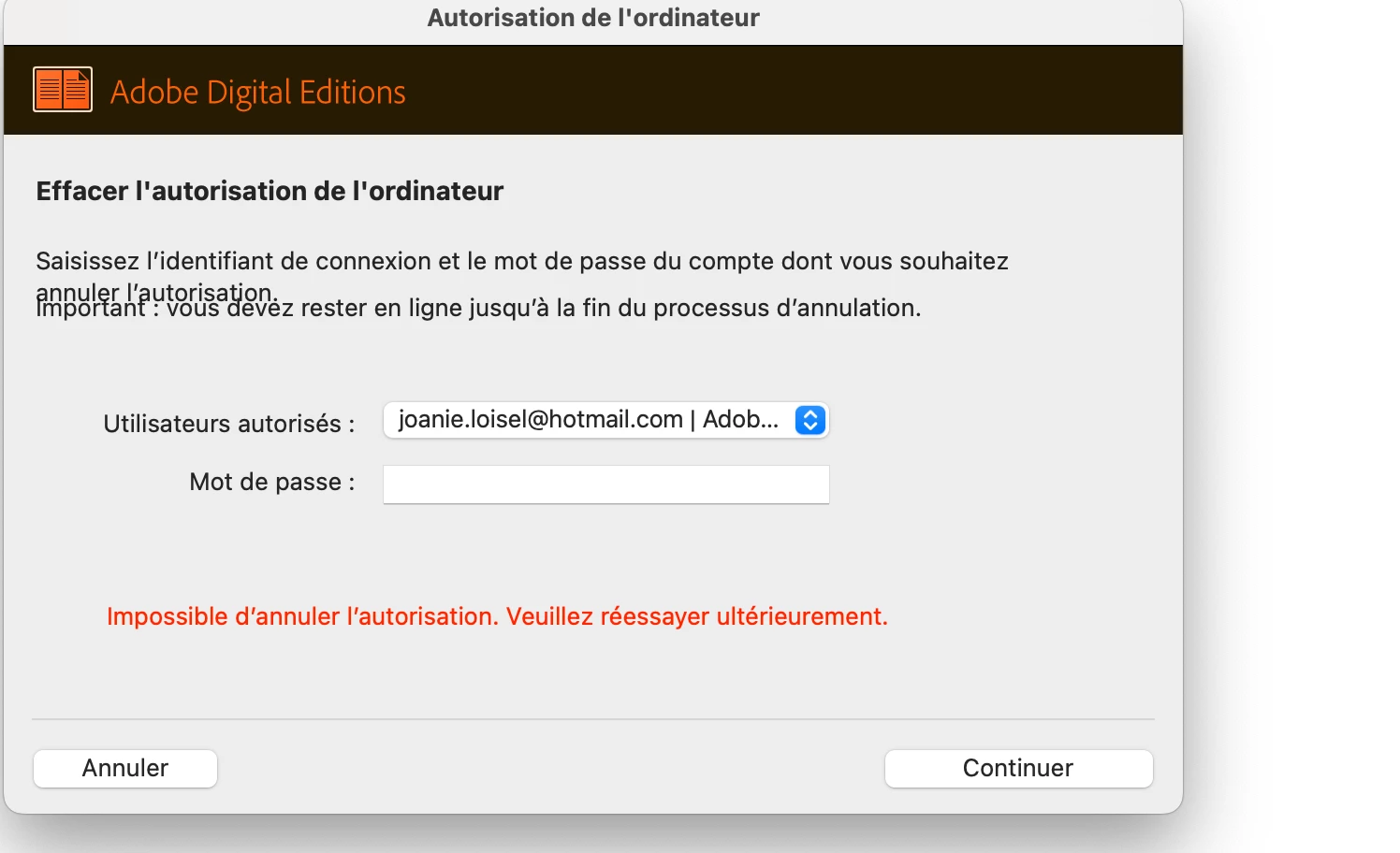 Lorsque je télécharge un livre de la bibliothèque, je tente de l'ouvrir sur Adobe digital Edition, mais ça m'indique un message d'erreur "E_ACT_NOT_READY". En fouillant, ça dit d'effacer l'autorisation de l'ordinateur, mais là aussi j'ai un message d'erreur qui dit " Impossible d'annuler l'autorisation".