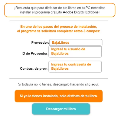 Hola, les cuento que he comprado 3 ebook en la plataforma bajalibros.com. Ellos dicen que para leerlos debo utilizar ADE, una vez alli utilizar el provedor BajaLibros, mi ID y contraseña que tengo con ellos.