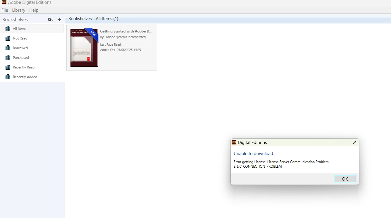 I got this error in DEigital Editions few days ago. I wanted to dowload an e-book from netlibrary. Before everything was wakiing fine. Any suggestion?