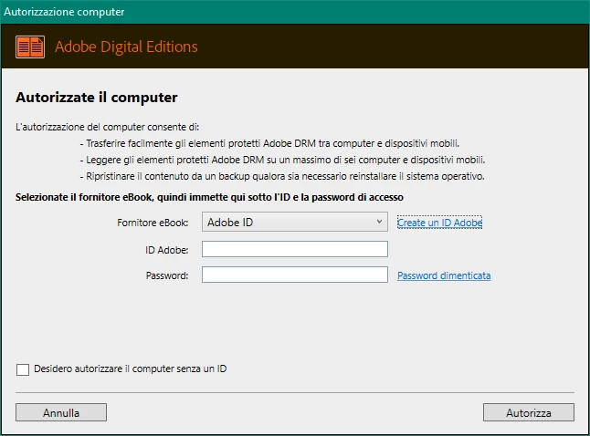 In this window, the link for create a new adobe id leads to a 404 error page. The software versione is 4.5.7.179634 used with the Italian Language.