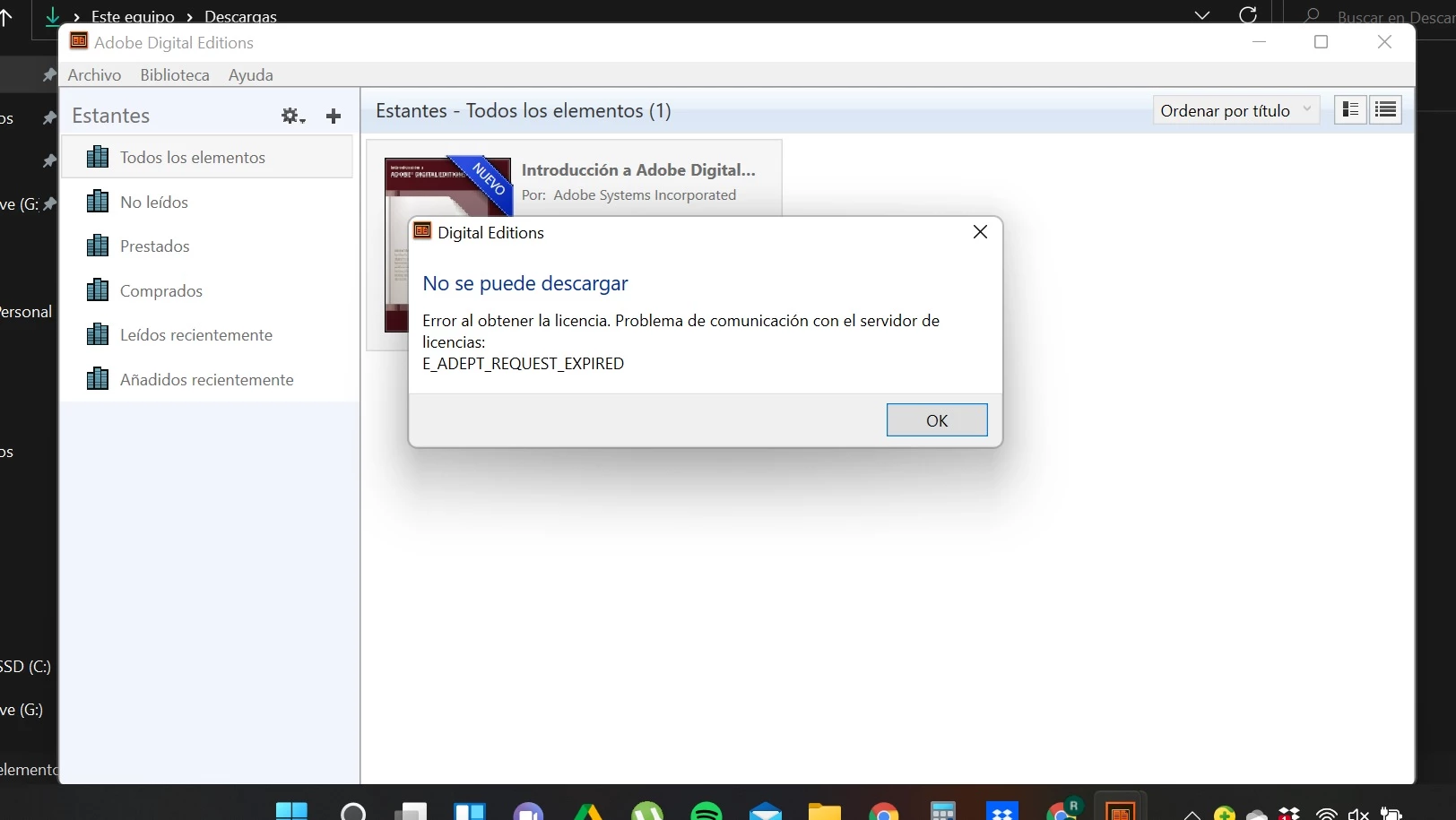 ¡Hola! Hace un año compré un libro digital que usé sin problemas en su momento con Adove Digital Editions. Mi ordenador era de sobremesa y tuve que descargarlo a traves de la casa del libro, ya que es con este programa y a traves de este sitio desde donde lo compre. No tuve ningun problema, y al final lo consegui. Ahora vuelvo a necesitar el mismo libro pero no puedo abrirlo, al intentar descargarlo en otro ordenador. La id de adobe es la misma, pero creo que he cambiado la contraseña. El programa me da error al obtener la licencia, que hay un problema de comunicacion con el servidor de licencias. ¿Qué puedo hacer? Muchas gracias.