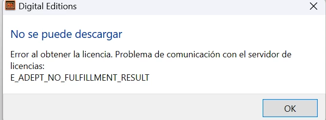 Buenas tardes, compre varios libros años atras y volvi instalar adobe digital y descargue los libros del proveedor y me sale el siguiente mensaje: