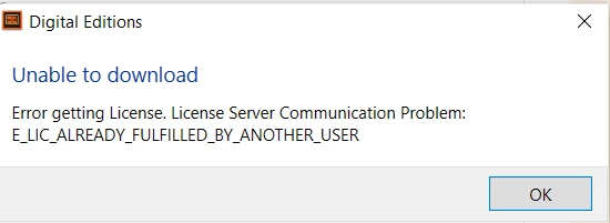 Hello, I purchase some books that are DRM  protected and try to open them to my laptop but I get this message below. What can I do? I tried to erase authorization but it didn't solve the issue.