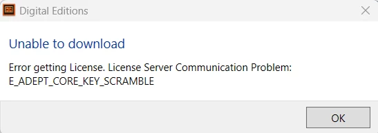 I tried to open with Adobe Deigital Editions an EPUB-file, which i downloaded from Google Play books. Now I get an Error message: "E_ADEPT_CORE_KEY_SCRAMBLE". Where is the problem. Earöier is ha workes perfectly. Also Files I have downloaded earlier are working okay.