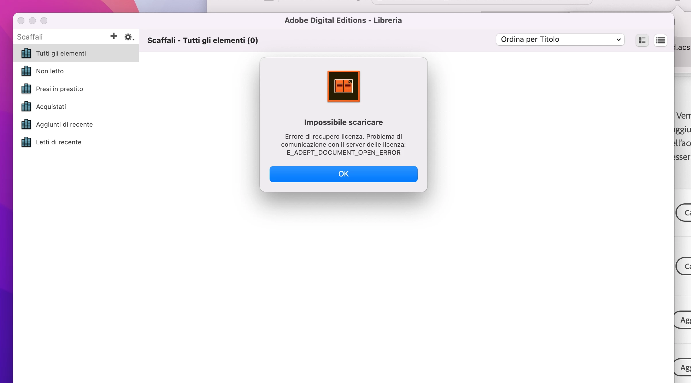 Ciao a tutti! Devo scaricare un file su Adobe Digital Editions, ma quando clicco sul file per fare ciò, mi appare il seguente codice di errore (sia su Mac sia su iPhone). Ho provato di tutto e non so che fare