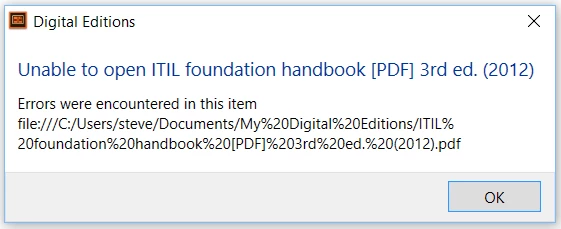 I received this error note when trying to open an e-book for school. It is an Adobe e-book, so I cannot open it with any other device/software. I also cannot open any of the non-school e-books that I have on Adobe Digital Editions (i.e. ones with no expiry date). I have rebooted my computer, I have uninstalled/reinstalled the program, and nothing works. My exam for this course is in a few weeks, and I need access to the e-book to study. I have contacted fellow students who have the e-book, and they are able to open it fine, so this is definitely an Adobe problem, not a publisher issue.