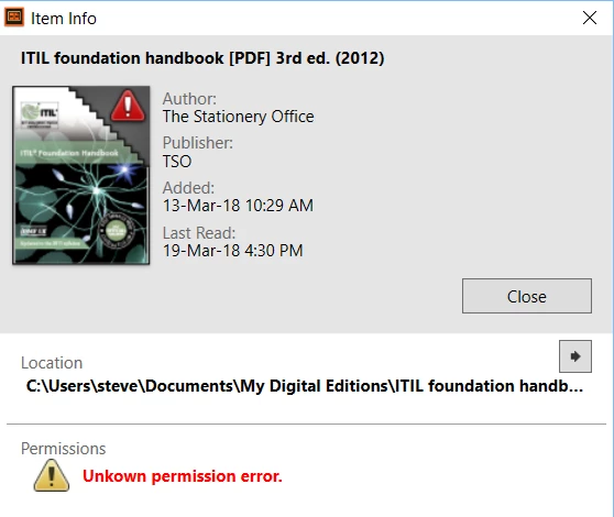 EDIT: When investigating further, I clicked on item info for the e-book and it says "Unknown Permission Error".