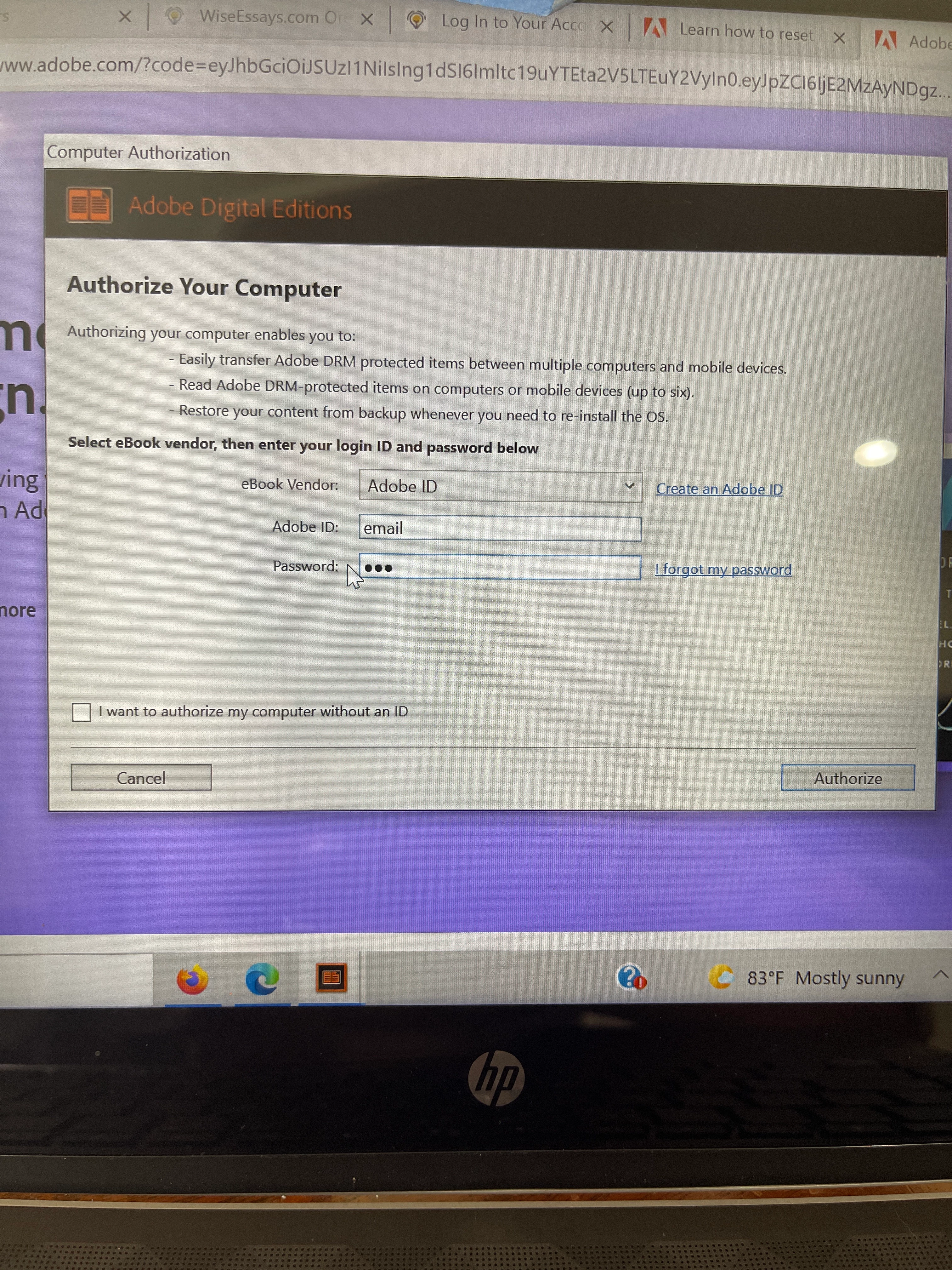 i bought a book for my class, created an account for adobe digital edition and now I can't even access the book it keeps asking me to authorize and not letting me go through that page that has my email and password even though it's not sending me anything via email to authorize